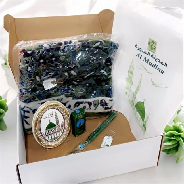مجموعة المدينة المنورة من مدينة الحبيب صلى الله عليه و سلم سجادة صلاة بتصميم الحرم النبوي الشريف و عجوة المدينة المنورة من أرض طيبة الطيبة